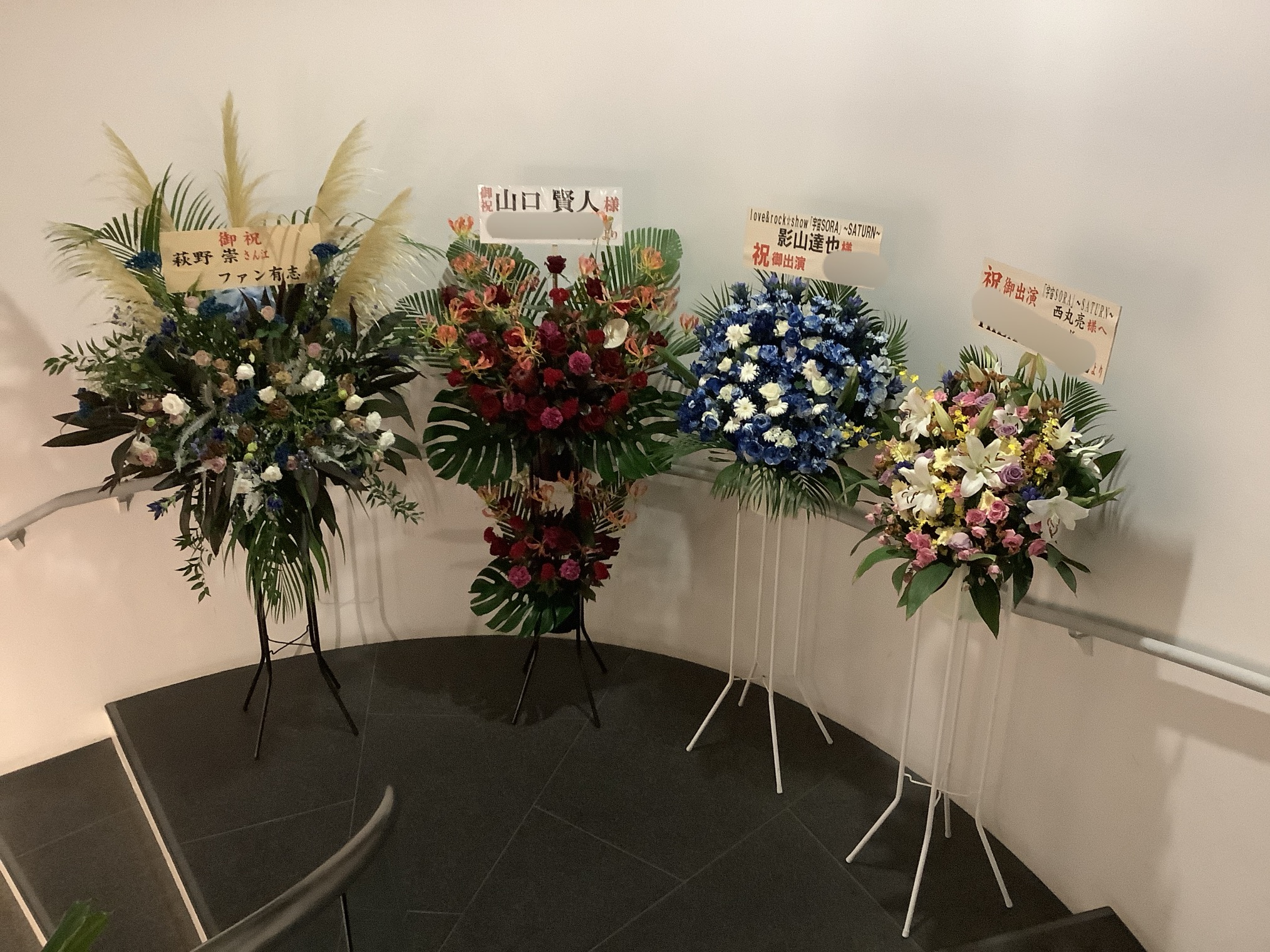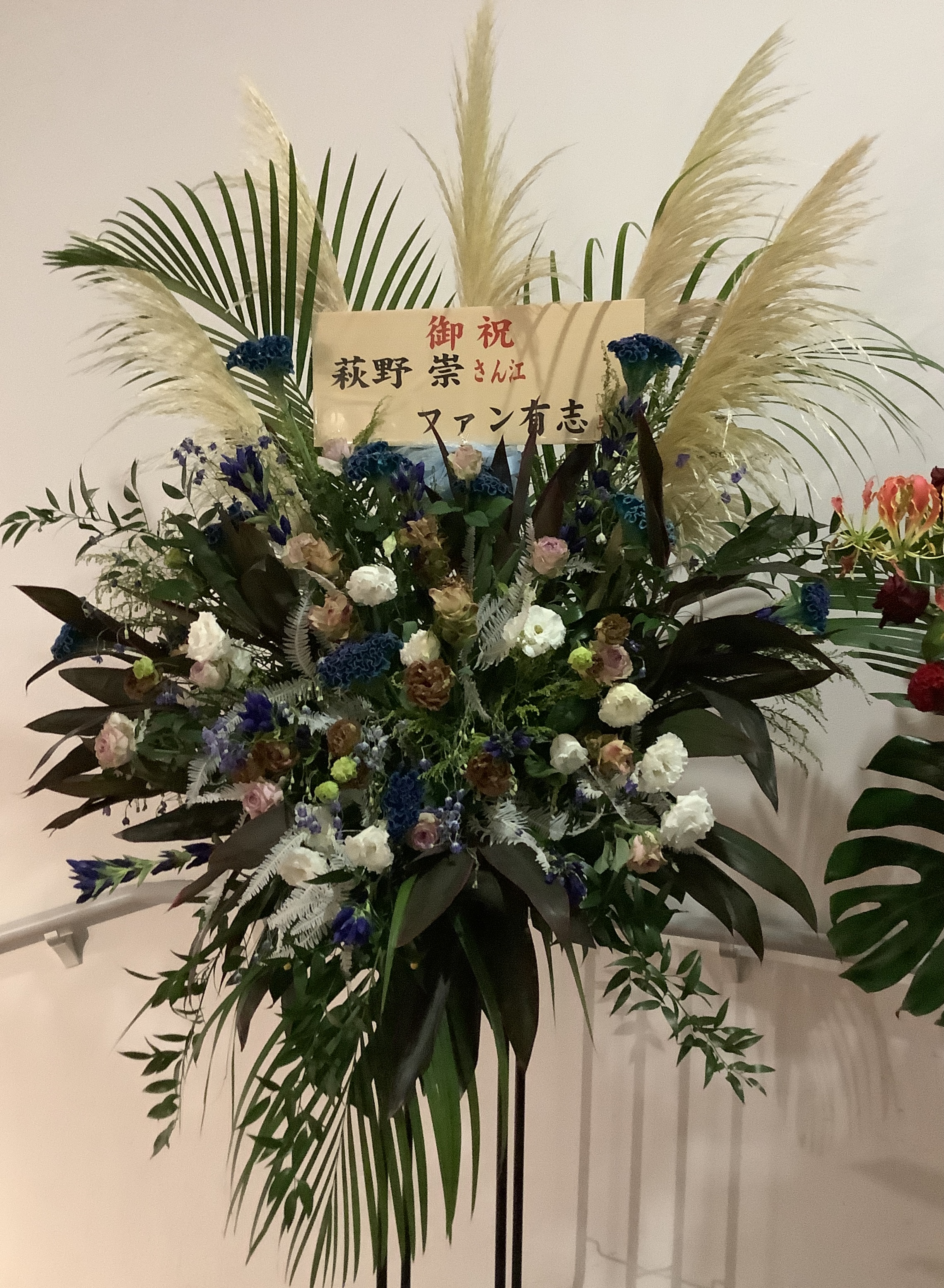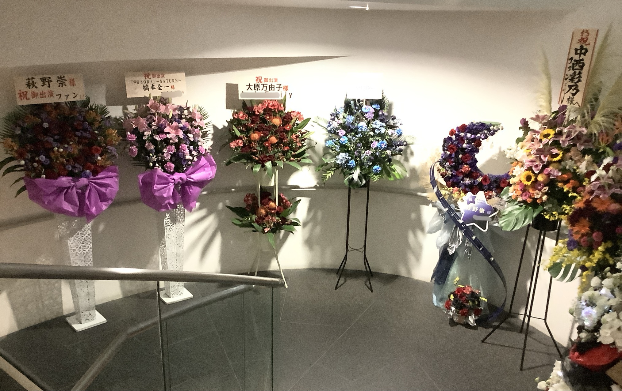 今回は祝い花の受付をしていただけると判明したのが開演3日前!! 6年ぶりのお花企画で、ふれんどさんがコロナ禍を経て今も営業を続けておられるかどうかわからず 不安な思いでメールをお送りしてみたところ速攻でお返事をいただけて本当にホッとしました。 タイトなスケジュールにもかかわらず、宇宙のイメージと萩野さんのビジュアルを参考に 「濃い目のブルー系を背景に、えんじ色、紫、白を組み合わせ、重厚かつ高貴な 感じで…」という盛りだくさんな希望にしっかりと応えてくださいました。 初日に観劇された方によりますと、階段を降りきったチケットもぎりに一番近いところに設置 されていたそうで、わたしが4日目に確認した時も同じ場所にあり、楽日までそのままでした。 階段の踊り場にたくさんのお花が並んでいる光景を見たのは本当に久しぶりで、感慨深かったです。 以下は開演4日目に私が撮った写真です。 |