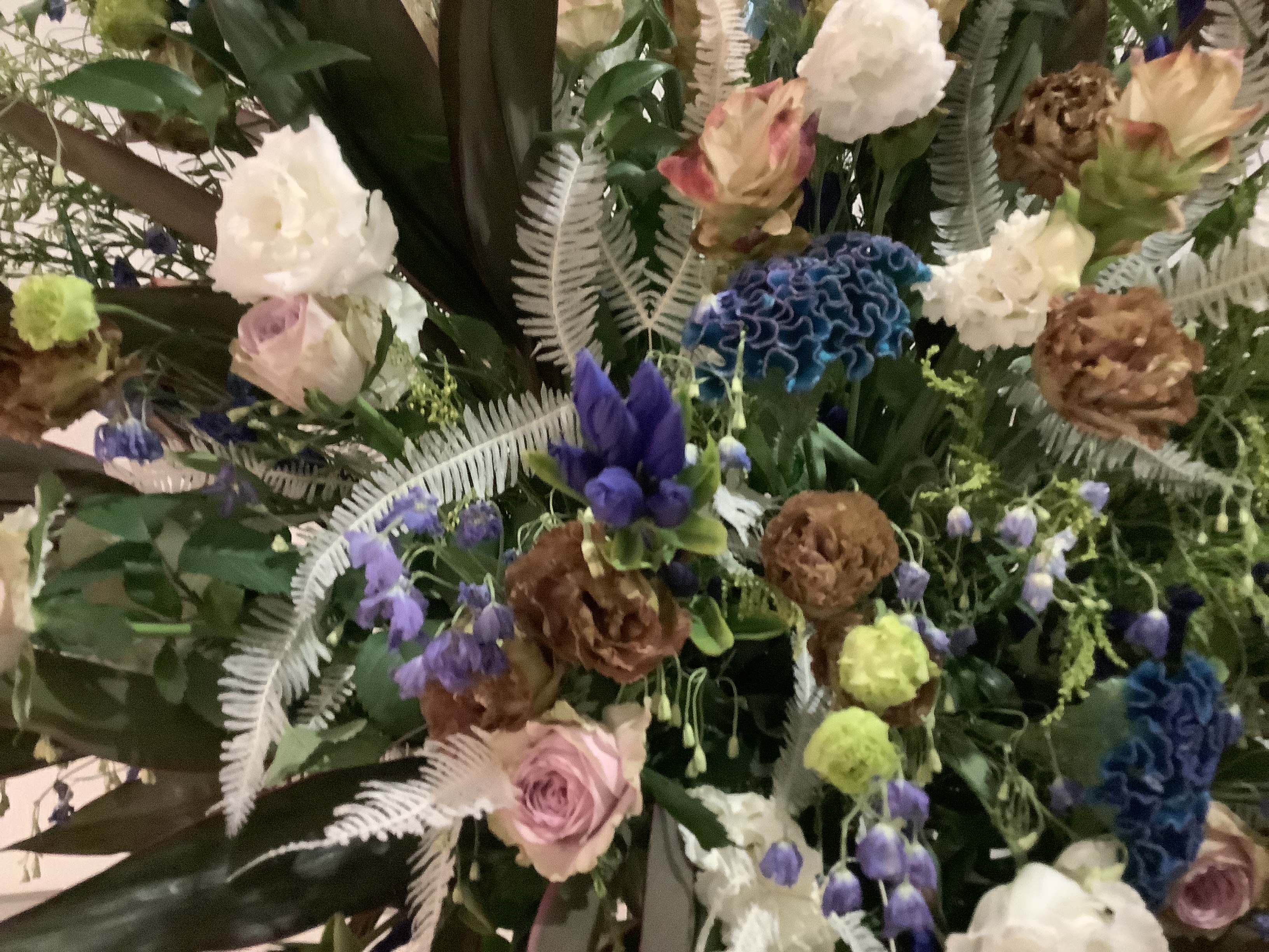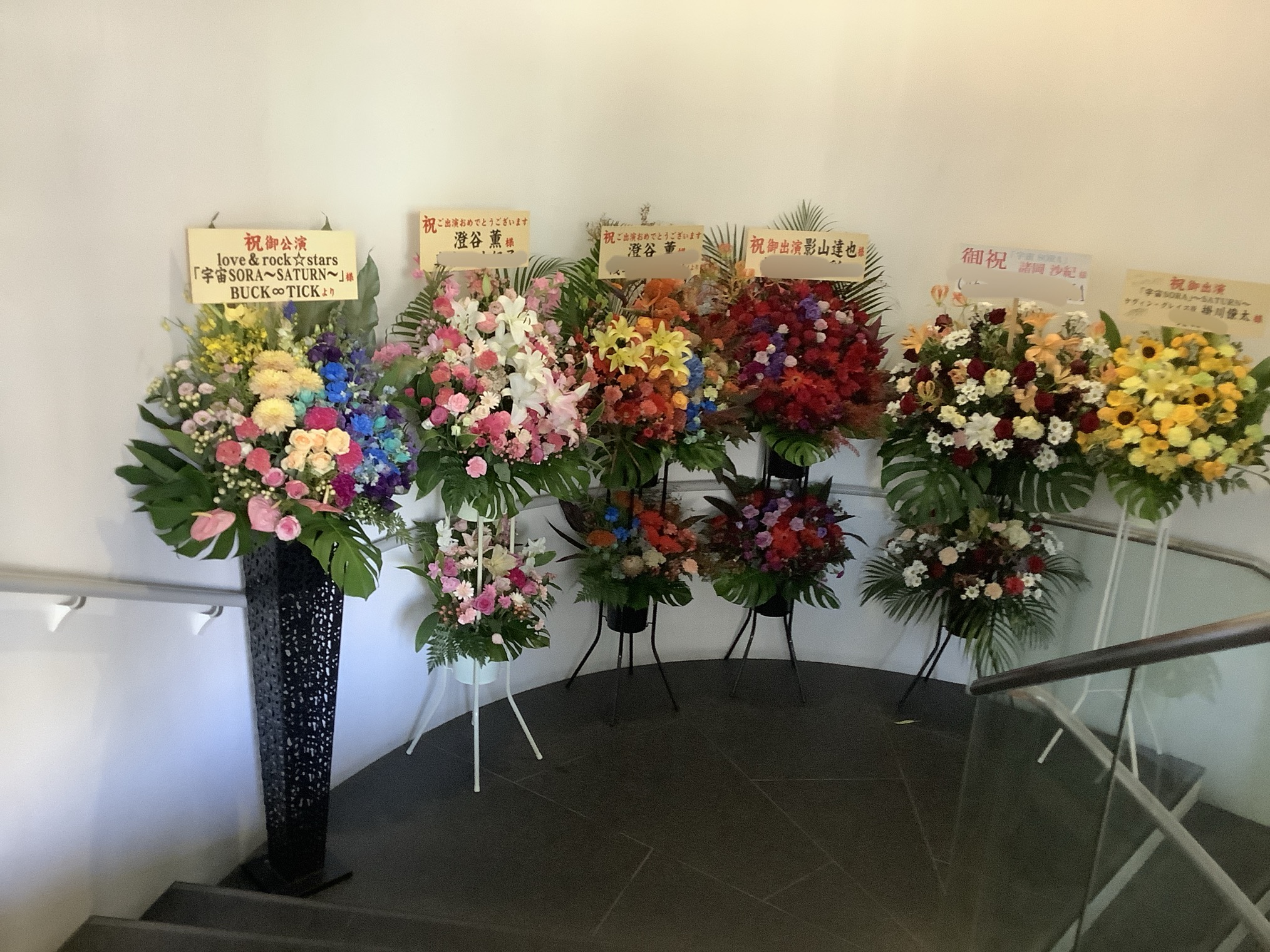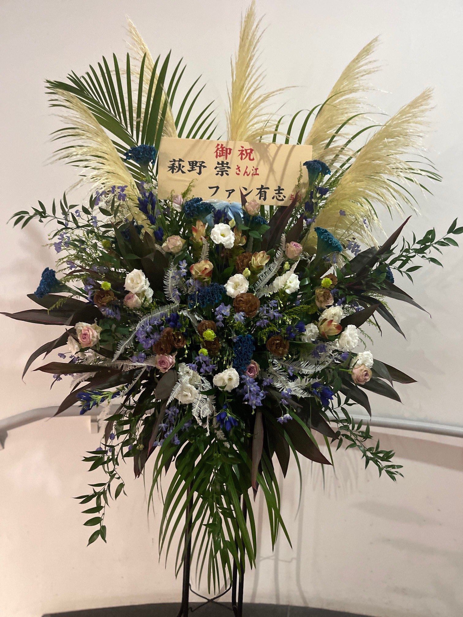 今回は祝い花の受付をしていただけると判明したのが開演3日前!! 6年ぶりのお花企画で、ふれんどさんがコロナ禍を経て今も営業を続けておられるかどうかわからず 不安な思いでメールをお送りしてみたところ速攻でお返事をいただけて本当にホッとしました。 タイトなスケジュールにもかかわらず、宇宙のイメージと萩野さんのビジュアルを参考に 「濃い目のブルー系を背景に、えんじ色、紫、白を組み合わせ、重厚かつ高貴な 感じで…」という盛りだくさんな希望にしっかりと応えてくださいました。 初日に観劇された方によりますと、階段を降りきったチケットもぎりに一番近いところに設置 されていたそうで、わたしが4日目に確認した時も同じ場所にあり、楽日までそのままでした。 階段の踊り場にたくさんのお花が並んでいる光景を見たのは本当に久しぶりで、感慨深かったです。 以下は開演4日目に私が撮った写真です。 |