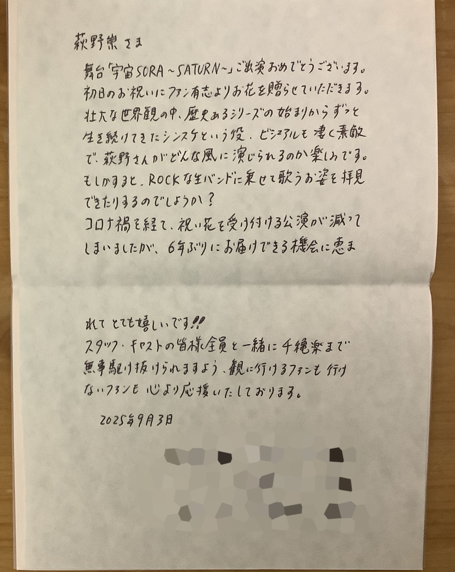 2025年9月3日(水)より六行会ホールにて上演される舞台「宇宙SORA〜SATURN〜」に出演される萩野崇さんに、みんなでお花をお贈りしようという企画です。萩野さんへの応援の気持ちを、一緒にお花に託してみませんか? 今回もずっとお世話になっているFlower Houseふれんどさんにお願いして、スタンド花を届けていただく予定です。お花につける木札の送り主名は「ファン有志」よりとします。 参加費用は一口2000円からとし、お一人様何口でもOKです。 ご賛同者数が予想以上に多く、締切時に予算を上回る場合には、減額をお願いする場合があります。 お支払いは、郵便振替または銀行振込でお願いいたします。恐れ入りますが、振込手数料はご負担ください。 また、6日(土)か7日(日)に劇場でお会いできる方は、直接手渡しも承ります。 ご賛同いただける方は、@萩野さんにお届けするカードに記入するお名前(ニックネームでも本名でも可)、 A申込み口数(記載されていない場合は一口とする) Bご希望のお支払い方法(郵便振替または銀行振込または手渡し) Cメールアドレス(XのDMの不具合に備えて) をご明記の上、管理人のXのアカウント(@kaoru_hagikuu)宛にDMをお送りください。折り返し、振込先口座番号、管理人の連絡先をお知らせするDMをお送りします。 通知の不具合等ある場合もございますので、12時間以上たっても返信のDMが届かない場合はリプライにてご連絡ください。 参加希望の受付締切は2025年9月2日(火)23時までとします。 受付締切後、お花企画参加者専用のグループDMを作成して招待いたします。 参加費用の入金受付開始は参加受付締切後とし、入金締切は2025年9月10日(水)までといたしますが、ご連絡いただければ多少遅れてもかまいません。 なお、入金確認には数日ほどお時間をいただく必要がございますので、どうぞご理解下さい。 お花とともに、簡単な応援メッセージと参加者名を記入したカードを作り、初日観劇予定のご賛同者の方にお預けしてプレゼントボックスに入れていただく予定です。ただし、お名前以外の萩野さんへのメッセージ等はお預かりできませんので、ご承知おき下さい。 その後の経過は、グループDMとこちらのページでお知らせし、Xにもお花の写真をアップする予定です。 参加者の皆さまのお名前はネット上では公開せず、最終的な申込み口数と参加人数についてはグループDMで報告いたします。 お花の領収証は管理人が保管し、後日グループDMに画像アップさせていただきます。 初参加はもちろん、気が向いたときだけ参加、お久しぶりかもしれない参加も大歓迎です。 ご不明な点があれば、お気軽にお問い合わせ下さいませ。 SNS等での拡散も、お願いできるとうれしいです。 |